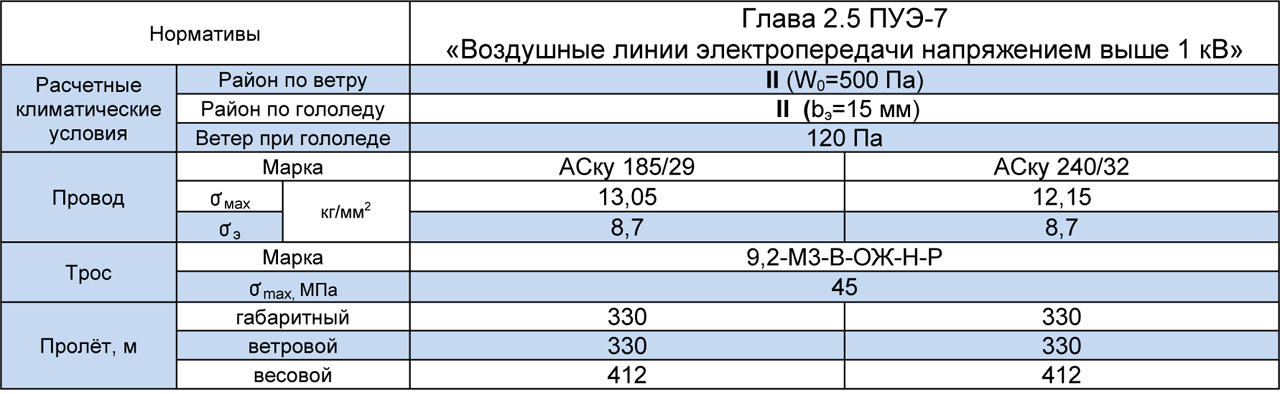 Ветер 4 (800 Па) Гололед 5 (30 мм) Провод АС 185/29 Трос ГТк20-0/50-9,1/64 Стойка СКС260.65-3 (7,0 т)