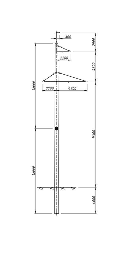 Ветер 2-3 (500-650 Па) Гололед 2-3 (15-20 мм) Провод АС95/16, АС120/19 Трос 9,2-М3-8-ОЖ-Н-Р Стойка СКС260.65-6 (7,7 т) Масса металла 1097 кг