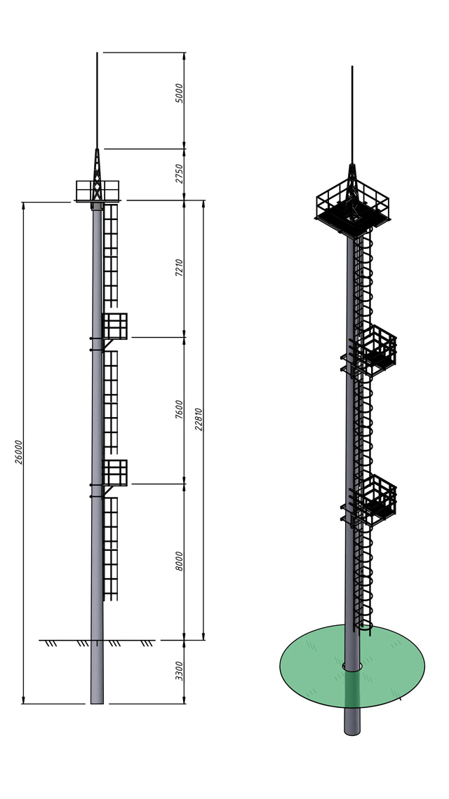 Прожекторная мачта ПМЖ-22.8ПП с двумя дополнительными площадками для отдыха на базе типовых мачт